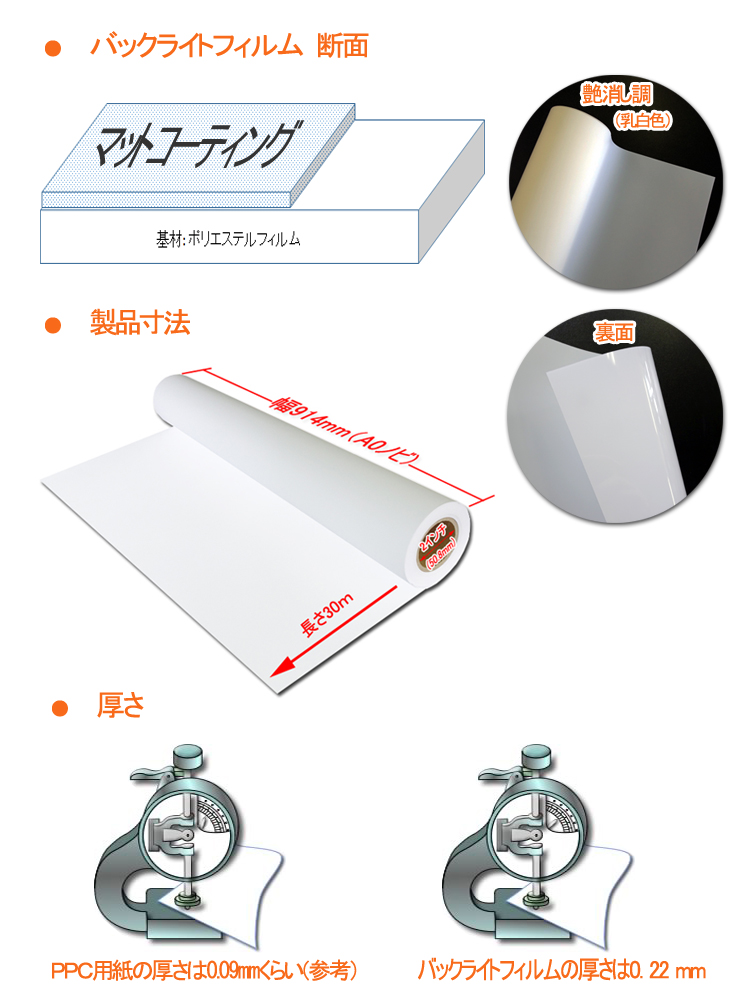 TOP バックライトフィルム914mm(A0ノビ)×30m ロールA0ノビ(914mm) インクジェットロール紙バックライトフィルム バックライトフィルム 2本入り 厚0.22mm 幅914mm(A0ノビ)×30m 価格: ¥32,390 (税込) [ポイント還元 323ポイント~] 販売期間: 数量: 箱 在庫: 在庫あり 在庫 在庫あり 返品についての詳細はこちら レビューはありません ▼ 商品画像▼ 商品動画 詳細 電飾看板用のバックライトフィルムです。 厚手のポリエステルフィルムに発色の良いインク受容層をコーティング。マット調の印刷画像はバックの照明でより美しく鮮明に再現されます。 水性の染料、顔料インクに対応。表打ち(表印刷)タイプです。 仕様 厚0.22mm 坪量267gsm 2本入 幅914mm×長さ30m 紙管内径:2インチ 商品画像 インクジェットロール紙 普通紙 薄手マットコート紙 厚手マットコート紙 RCフォト光沢紙 RCフォト半光沢紙 マット合成紙 マット合成紙(グレー糊付) 防炎クロス エコノミークロス 不織布 透明フィルム 版下フィルム バックライトフィルム トレーシングペーパー ゴールド・シルバー(糊付き) 溶剤用ロール紙 RCフォト光沢紙 RCフォト半光沢紙 防炎ターポリン(片面印刷) 防炎ターポリン(両面印刷) マット合成紙 バックライトフィルム インクジェットカット判 普通紙 RCフォト光沢紙 RCフォト半光沢紙(絹目) 光沢紙 微光沢・半光沢紙 マット合成紙 版下フィルム バックライトフィルム 透明フィルム カラーペーパー ラベル・シール・転写 普通紙シール 光沢紙ベースラベル 光沢フィルムシール マットフィルム(合成紙)シール アイロンプリンター用紙 水転写シール ホログラフィックシール ゴールド・シルバーシール タトゥーシール 透明フィルムシール 丸型フィルムラベル レーザープリンタ対応 普通紙 普通紙シール 両面半光沢紙 カラーペーパー マットフィルムラベル サイズ別ロール紙 A4(210mm) A3ノビ(329mm) A2(420mm) A2ノビ(432mm) A1(594mm) A1ノビ(610mm) A0(841mm) A0ノビ(914mm) 42インチ(1067mm) B0ノビ(1118mm) 50インチ(1270mm) 1270mm 1370mm 1380mm 1400mm サイズ別カット判 名刺(55×91mm) L判(89×127mm) 2L判(127×178mm) はがき(100×148mm) A6(105×148mm) A5(148×210mm) A4(210×297mm) A3(297×420mm) A3ノビ(329×483mm) B5(182×257mm) B4(257×364mm) カレンダー ■今日 ■店休日 ■祝日 営業時間:平日9:00~18:00 土日祝日休み (他、夏期・冬期休業あり)
