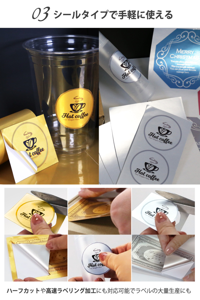 シルバー、ゴールドカラーで高級感のあるラベルシールが作成可能。