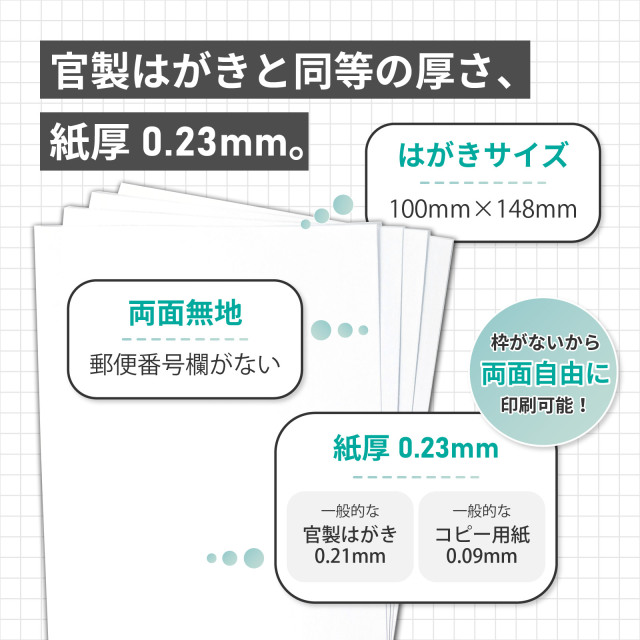 一般的な官製はがきと同じサイズ100×148mmの普通紙です。紙厚は0.23mmと、官製はがきと同等の厚さです。一般的なコピー用紙の2倍以上の厚みがあり、こしが感じられる仕様となっています。