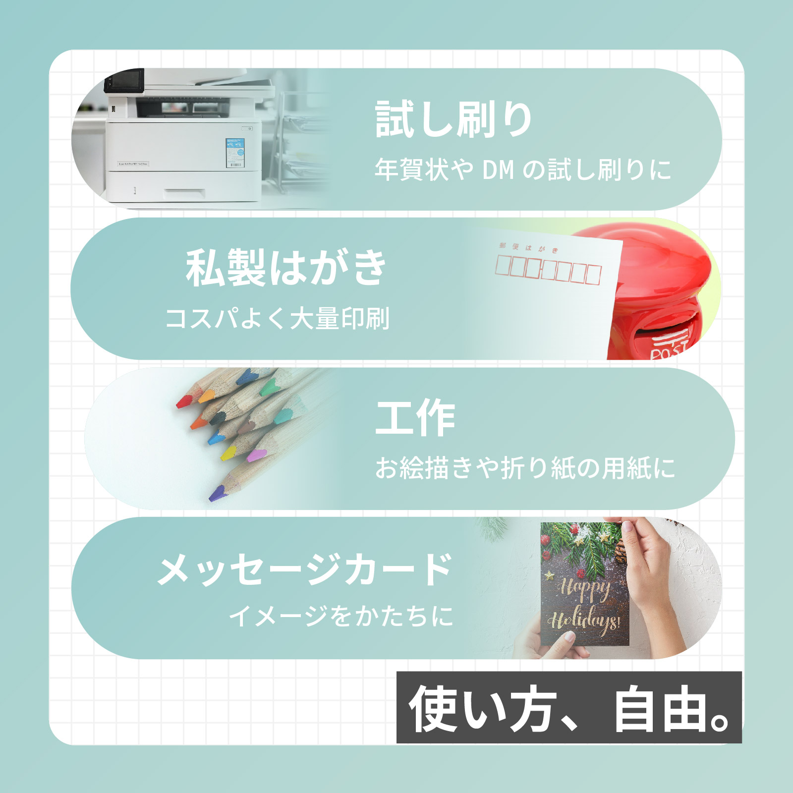 年賀状・DMの試し刷りや、領収書・資料等をコスパ良く印刷することができます。他にも、工作やメモ・メッセージカードに使用したりと、幅広いシーンで活用できます。