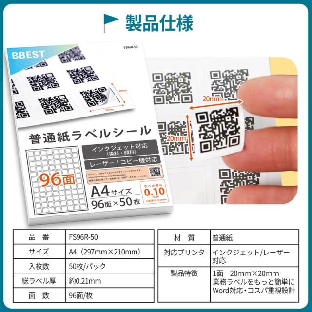 A4サイズ・96面・50枚入り(合計4,800ラベル)で在庫管理・出荷管理・資産管理・設備点検など、業務用途に最適。