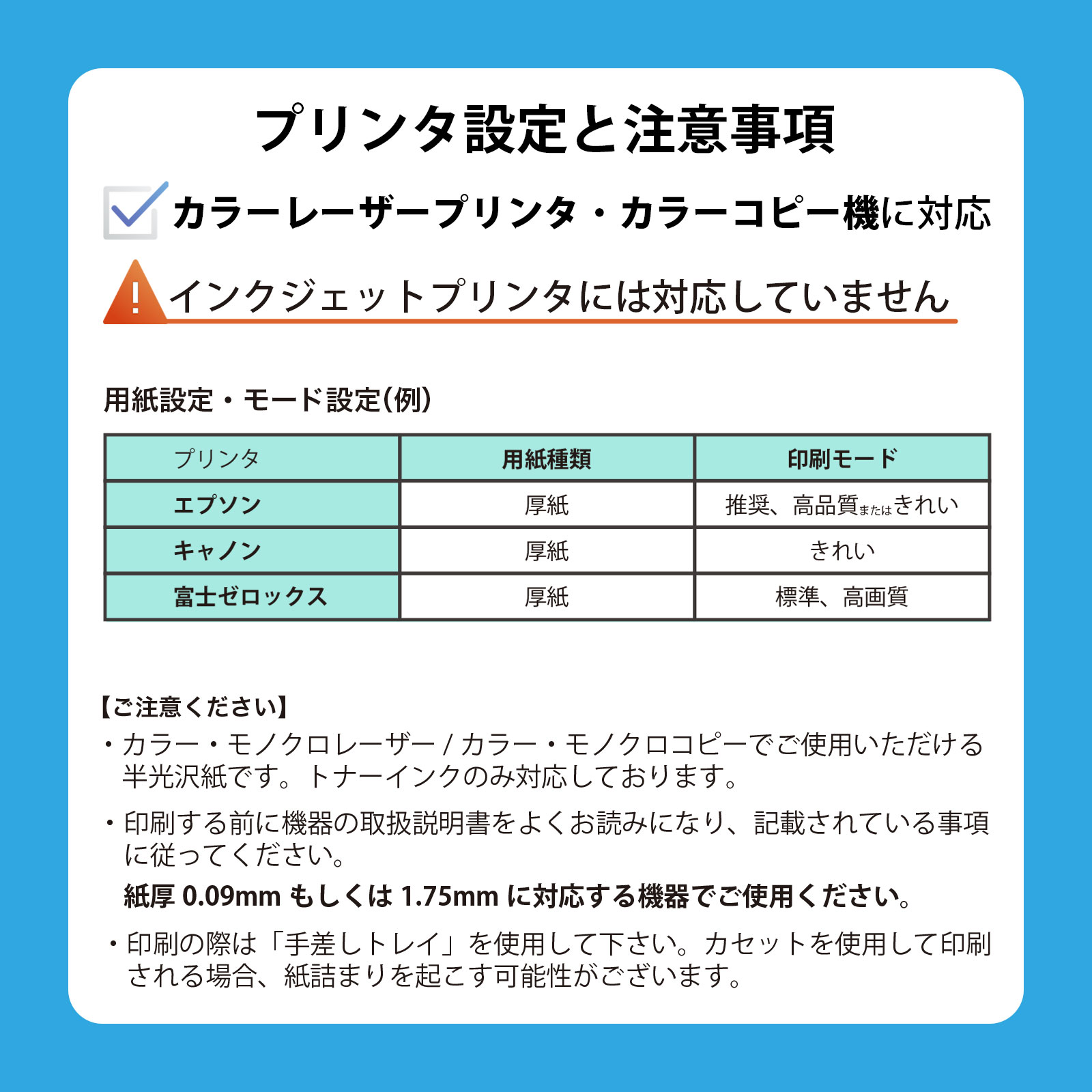 ・印刷する前に機器の取扱説明書をよくお読みになり、記載されている事項に従ってください。紙厚0.09mmもしくは0.175mmに対応する機器でご使用ください。