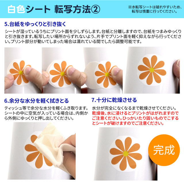 ※水で濡らして転写するため、水分で破損、変形するものには不向きです。水分を吸わない素材は、転写、乾燥に時間がかかります。